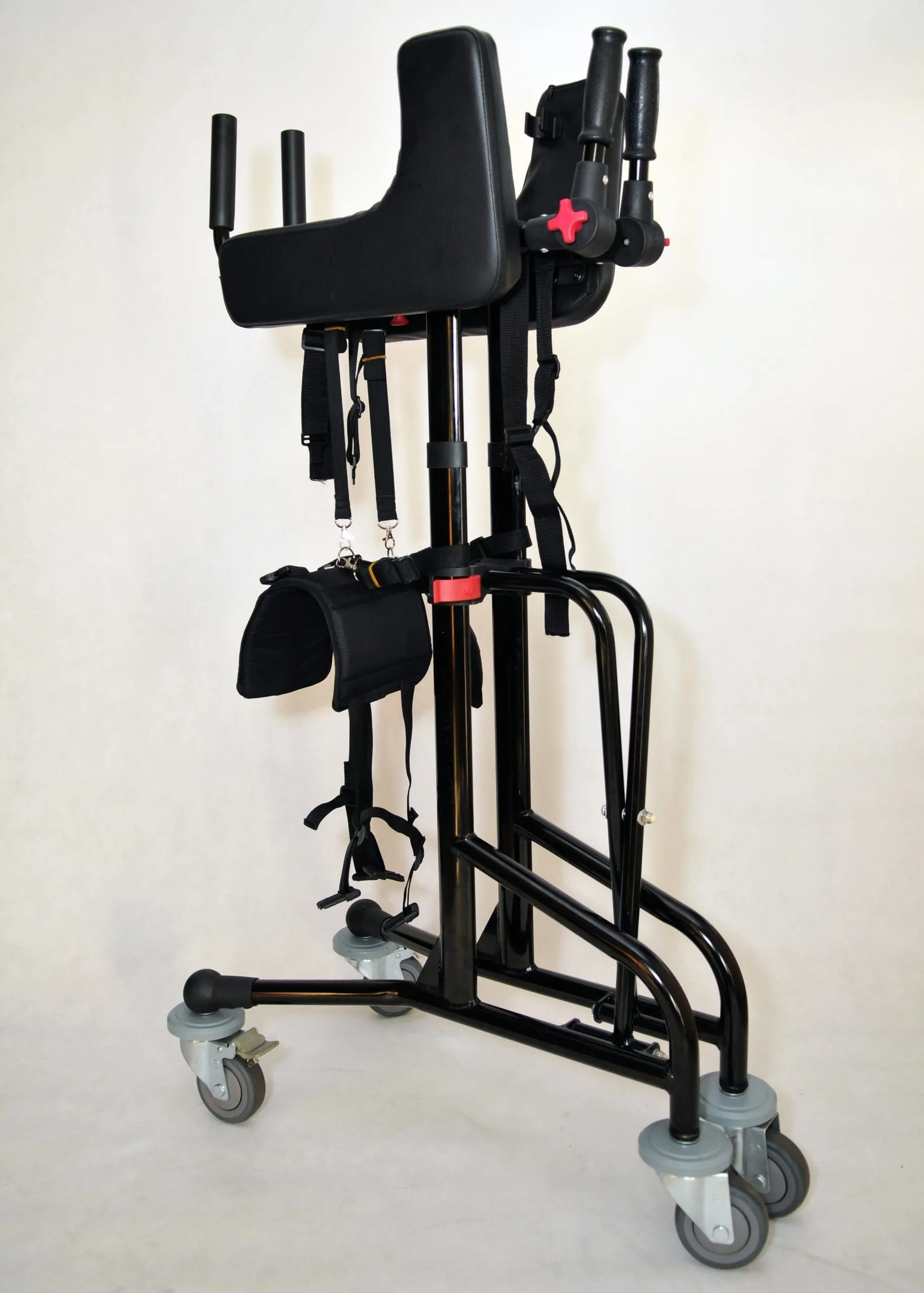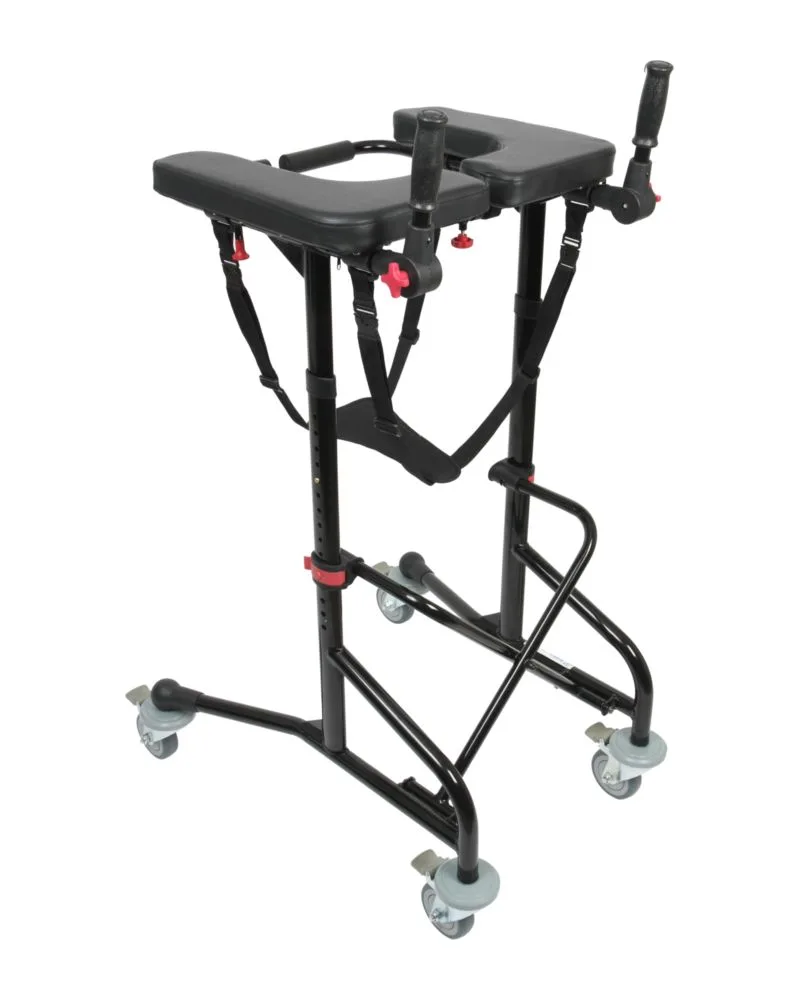 Všetky kolesá sú vybavené plastovými nárazníkmi, ktoré chránia steny alebo nábytok pred poškodením. Predné kolieska sú aretačné. K štandardnej výbave chodítka patria ručné brzdy zadných koliesok a bezpečnostný postroj so sedlom v cene.